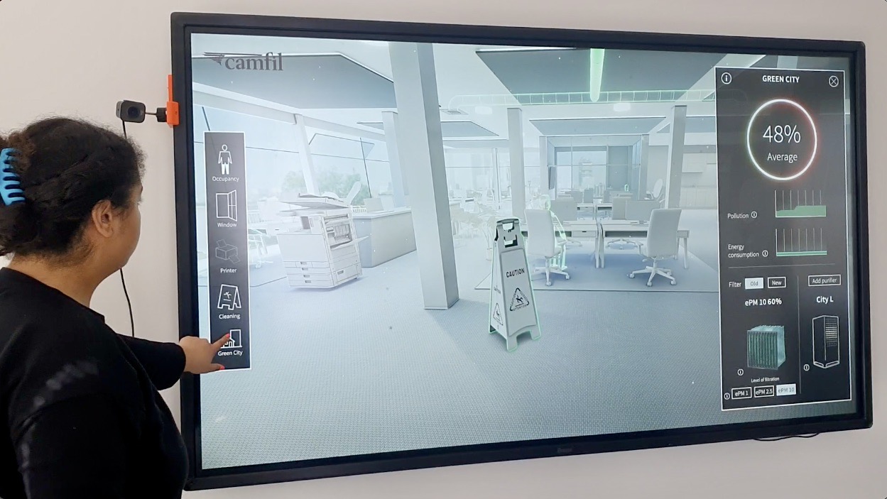 The solution was a sleek custom-made touchscreen VR app that simulates a real-world office environment. The app visualises and demonstrates the different factors that affect IAQ in the workplace.